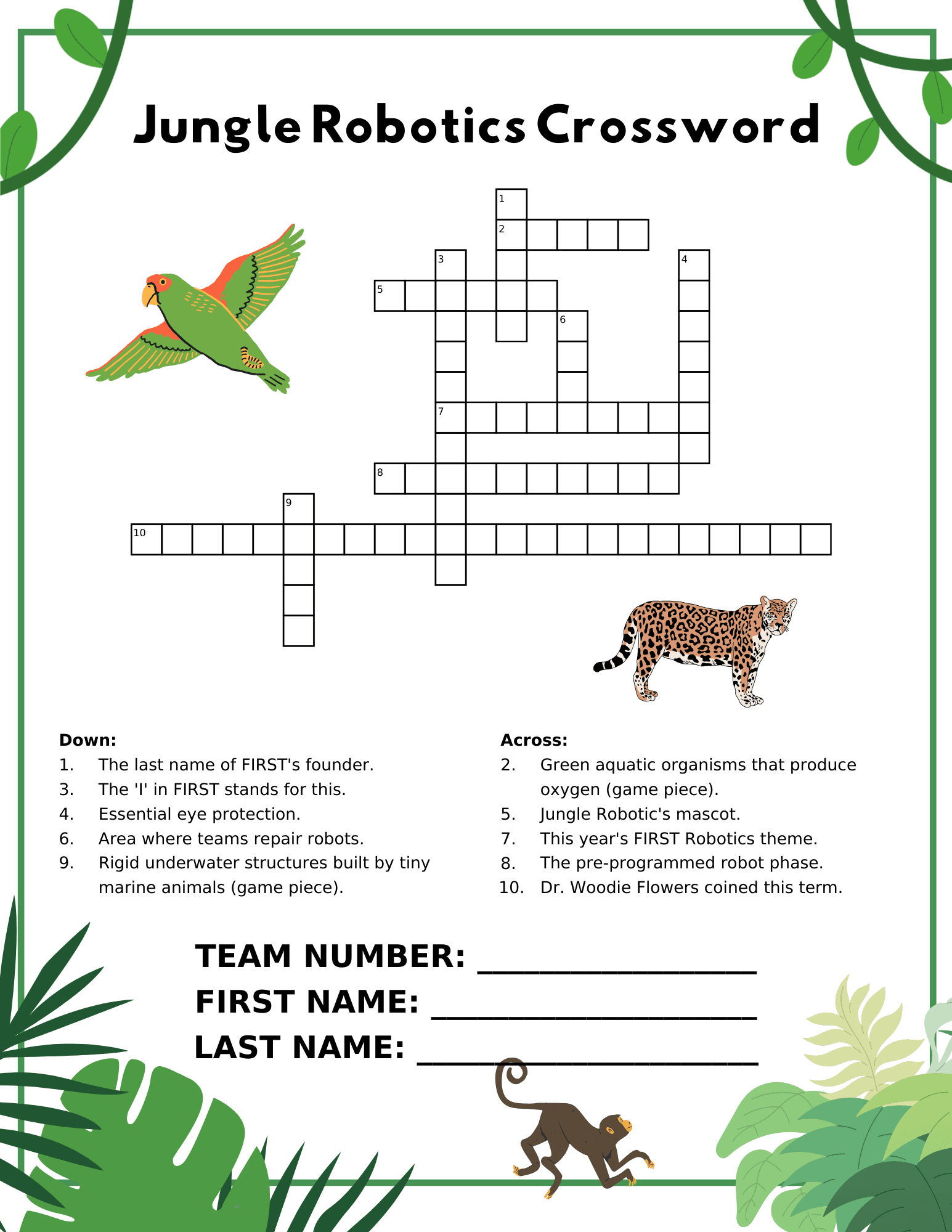 I created flyers, crosswords, team merch, coloring books, and other designs, ensuring consistent visuals that reflected Jungle Robotics’ spirit.
