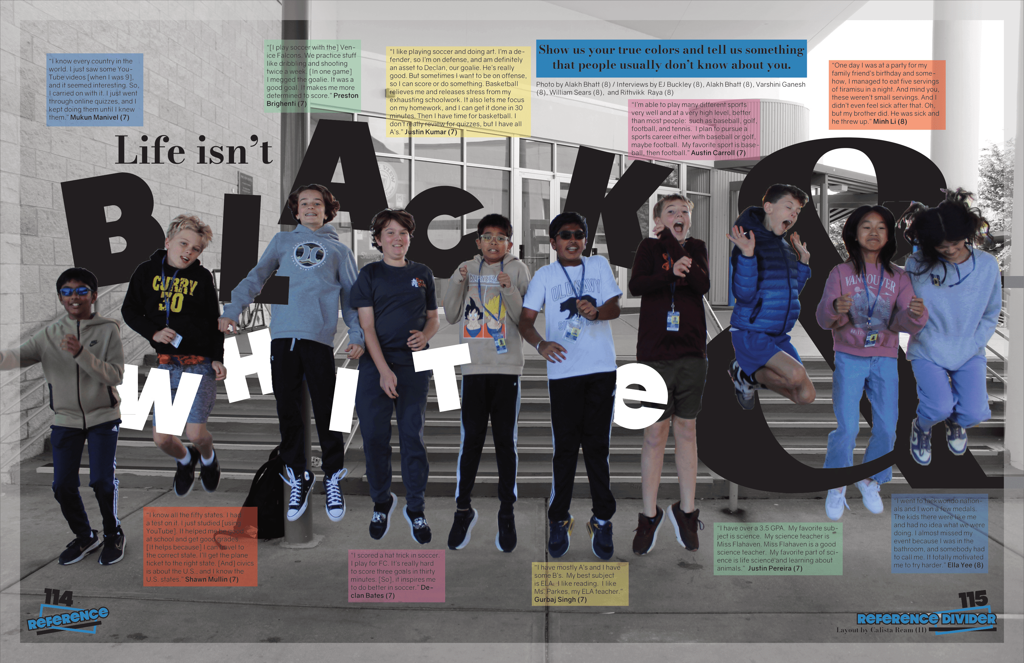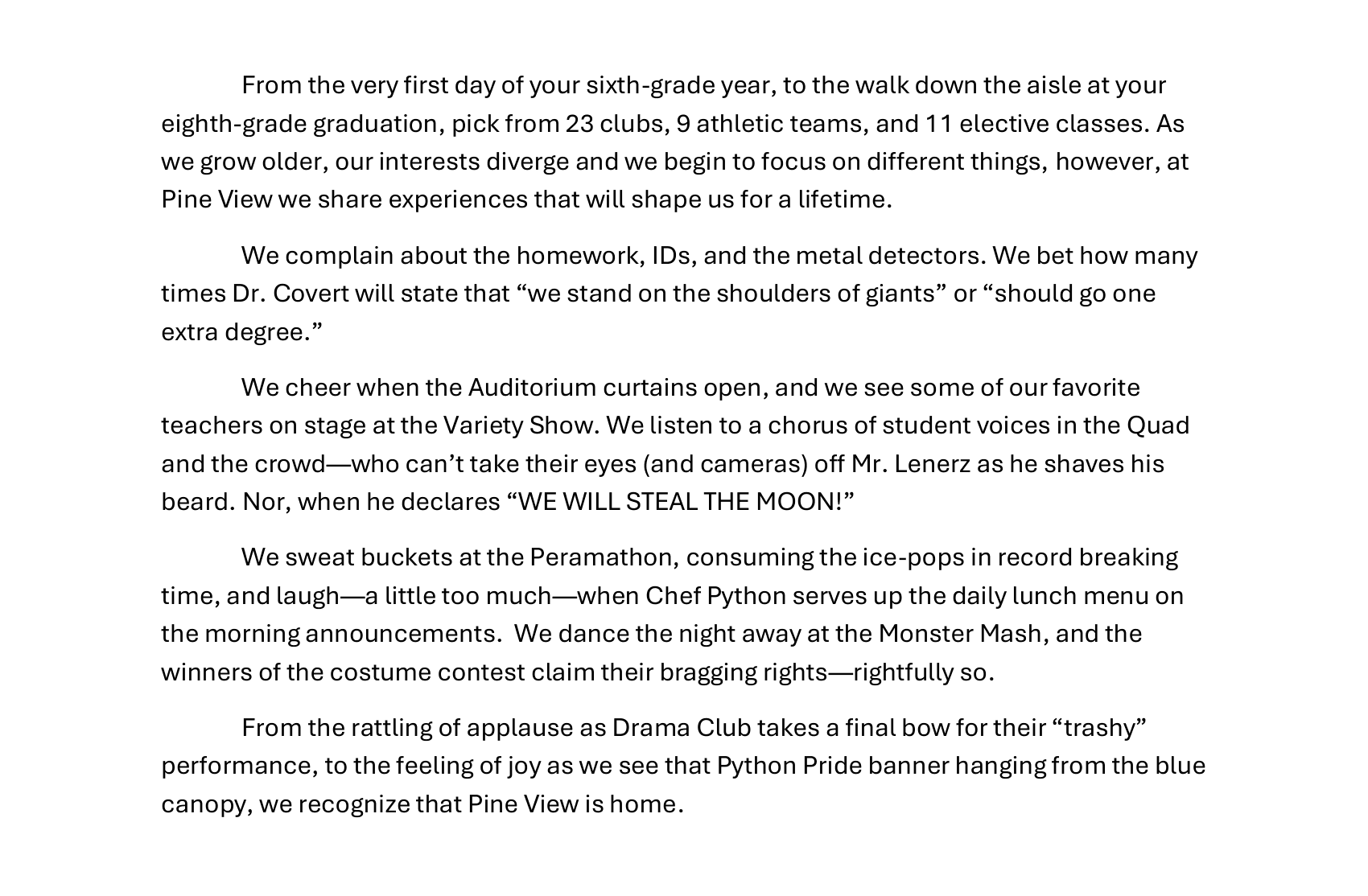 As Editor-in-Chief, wrote theme copy centered on “In Focus,” highlighting the full scope of middle school life, and contributed other editor pieces. Ensured cohesive storytelling across 144 pages.