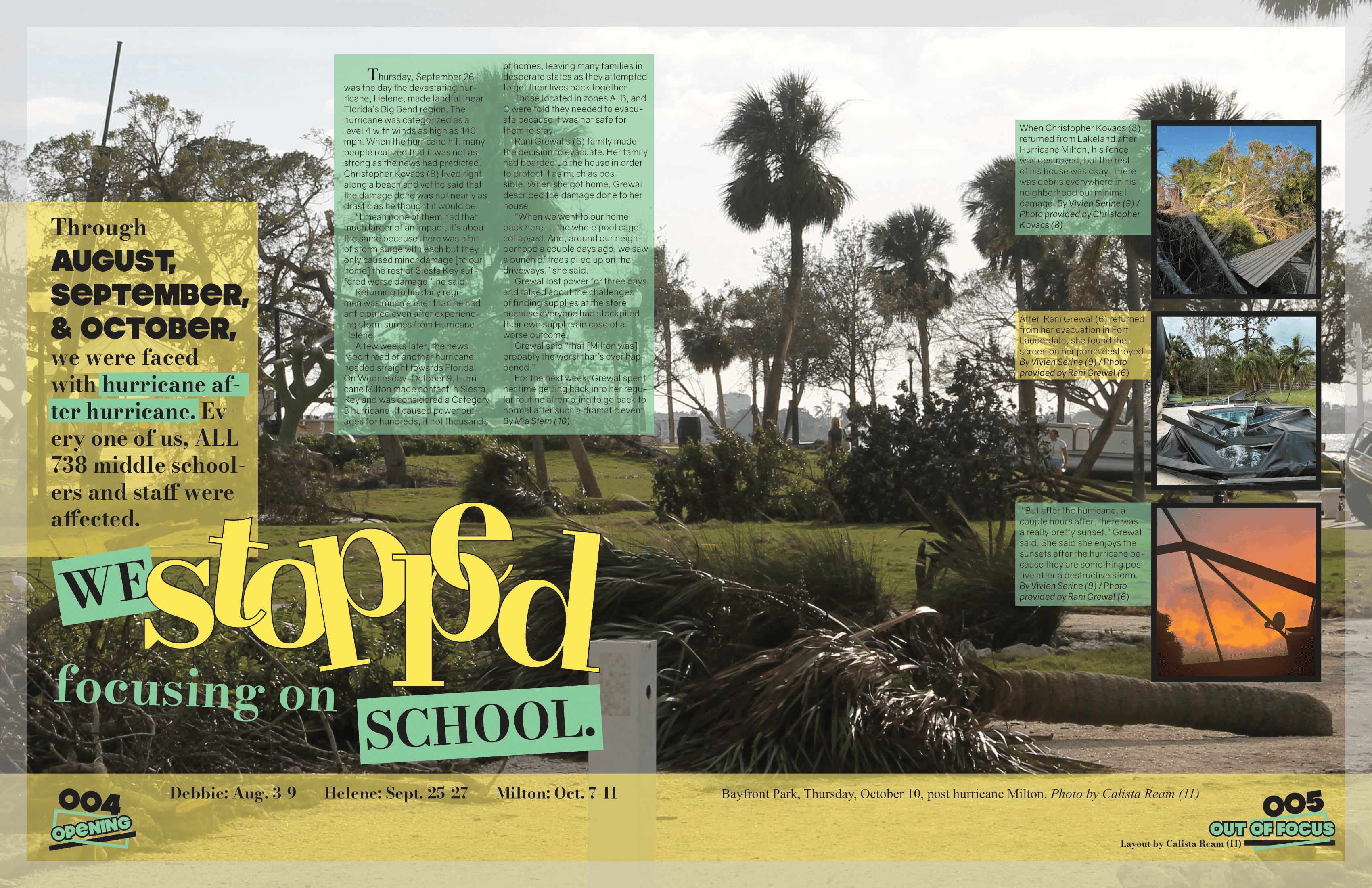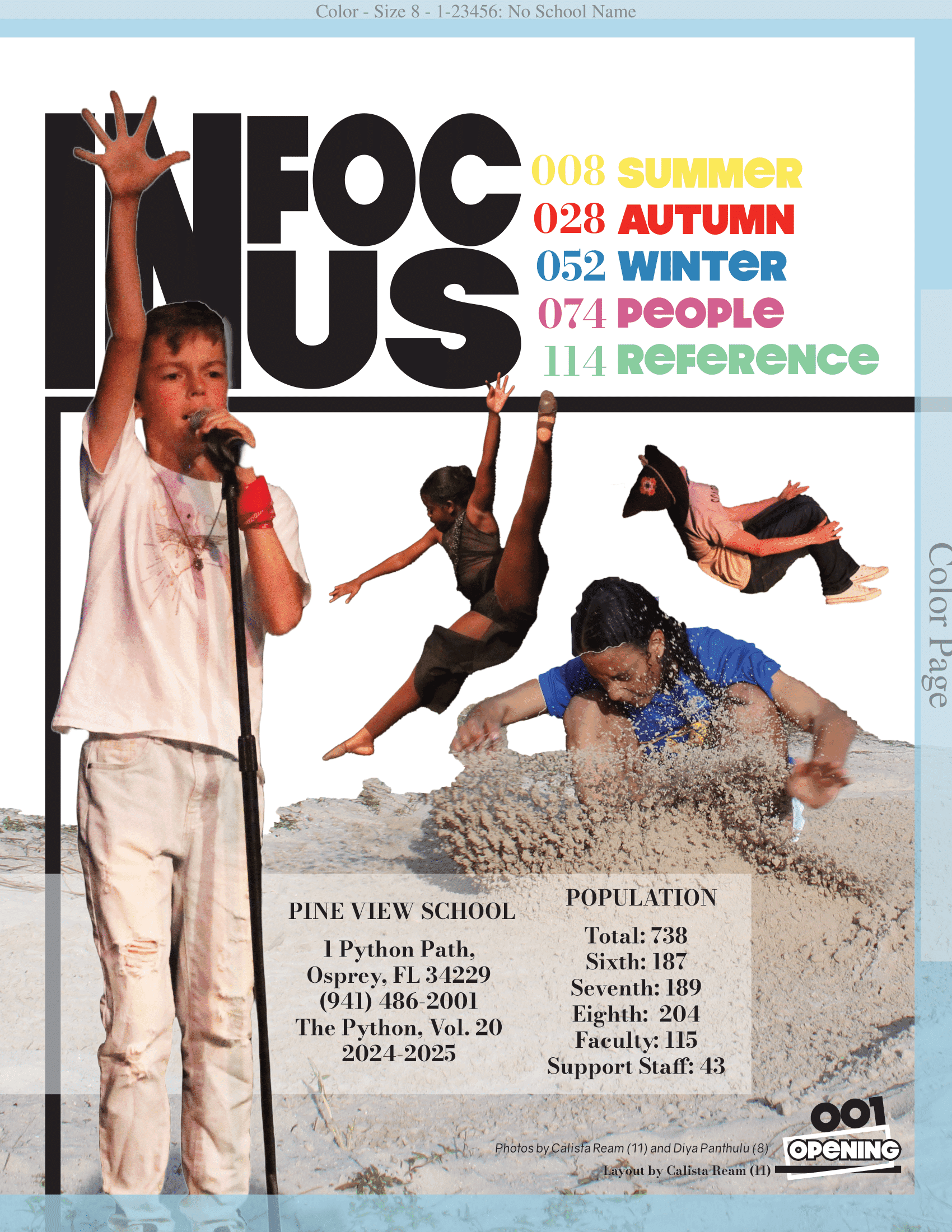 i led 40 middle schoolers to create 144-pages centered on the theme In Focus, highlighting the full scope of student life. I wrote theme copy, contributed reporting, taught journalism, implemented systems, and guided design and photography. The finished book earned Pine View’s first All-Florida distinction in our 56-year yearbook history.