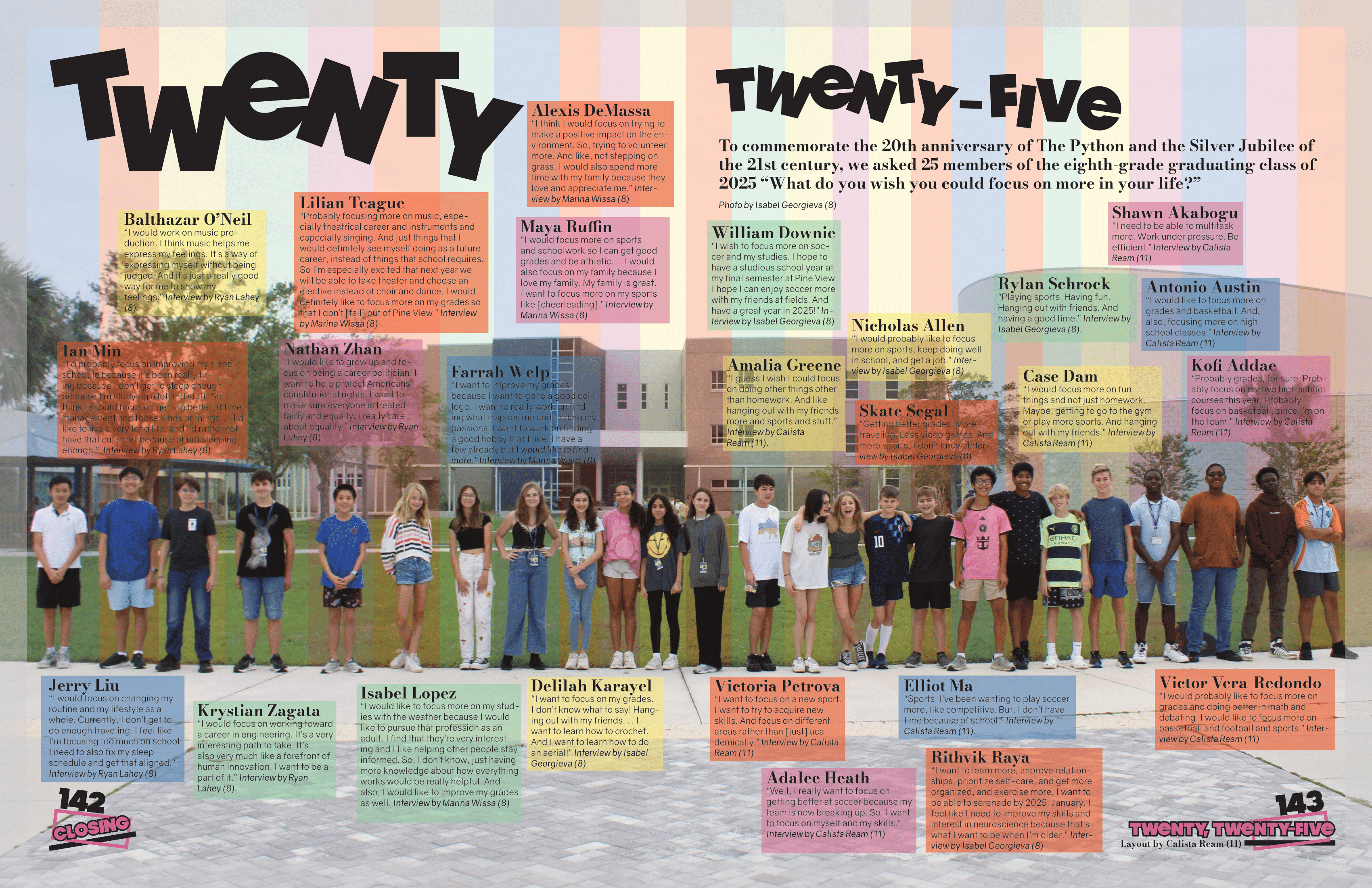 Ensured broad representation of grades, activities, and student experiences, reflecting the full middle school community in coverage and 25 year anniversary of The Python. implemented name chart to track coverage.